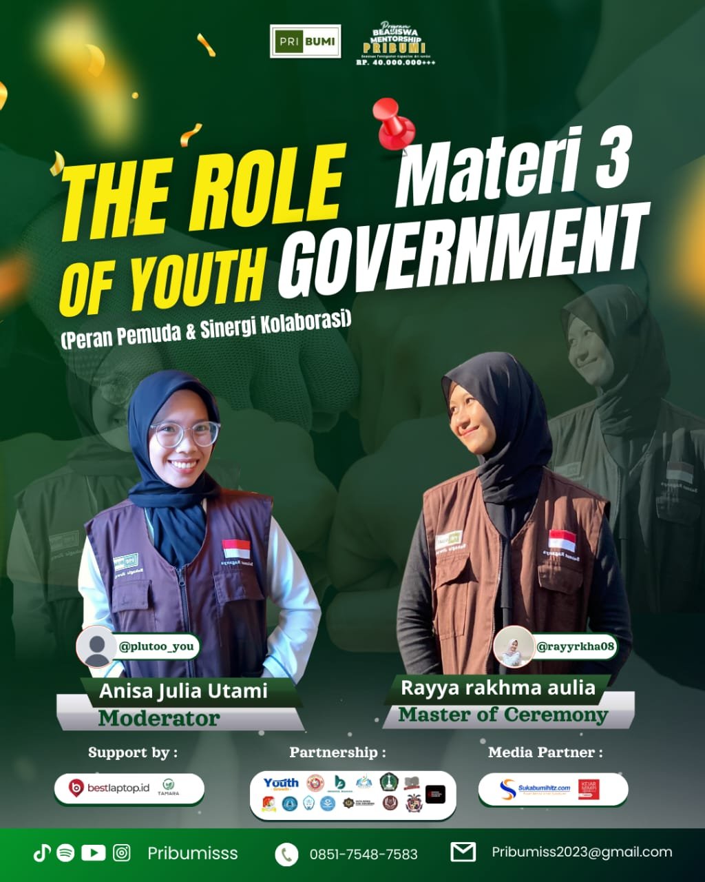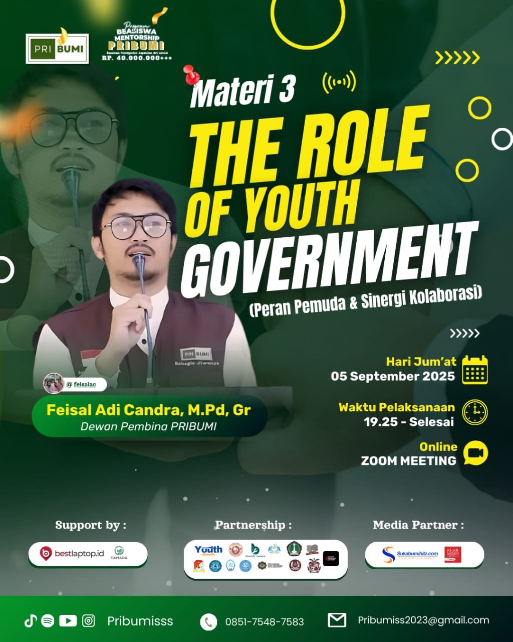 Dalam sesi kali ini, akan hadir Feisal Adi Candra, selaku Dewan Pembina Pribumi, sebagai narasumber utama. Beliau akan membagikan pandangan, pengalaman, sekaligus motivasi yang relevan dengan kondisi pemuda Indonesia saat ini. Jalannya acara akan dipandu oleh MC Rayya Rakhma Aulia (alumni Pribumi Batch 2) dan moderator Anisa Julia Utami (alumni Pribumi Batch 2).