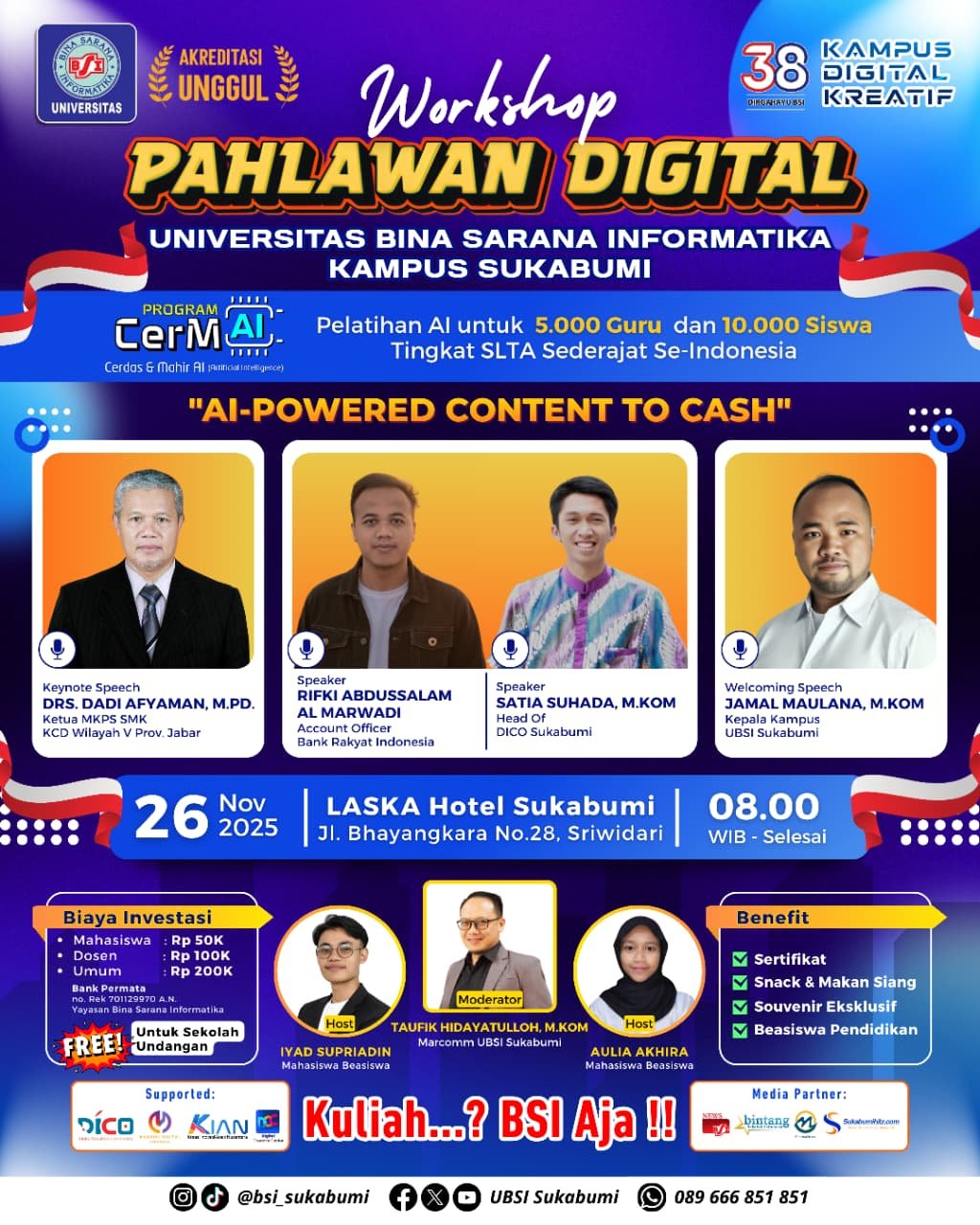 Sukabumihitz – Universitas Bina Sarana Informatika (UBSI) Kampus Sukabumi menggelar Workshop Pahlawan Digital “AI Powered Content To Cash” sebagai bagian dari Program CerMAI (Cerdas & Mahir AI). Program nasional ini menargetkan 5.000 guru dan 10.000 siswa tingkat SLTA sederajat di seluruh Indonesia agar lebih cerdas dan terampil memanfaatkan kecerdasan buatan (AI).