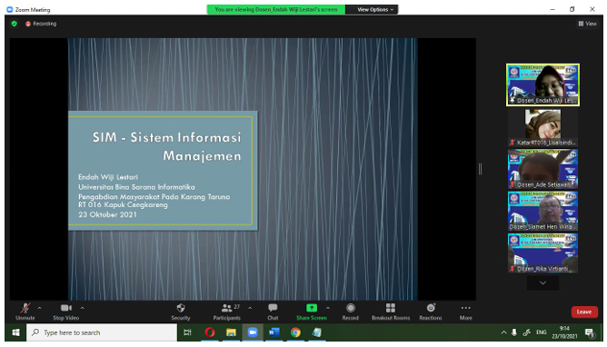 Kegiatan ini berlangsung secara daring melalui Zoom Meeting pada Sabtu, 23 Oktober 2021. Meskipun pandemi Covid-19 masih berlangsung, semangat peserta tetap tinggi untuk belajar dan berkolaborasi. Puluhan peserta yang hadir terdiri dari dosen dan mahasiswa UBSI serta para anggota Karang Taruna RT 016 Kapuk Cengkareng.