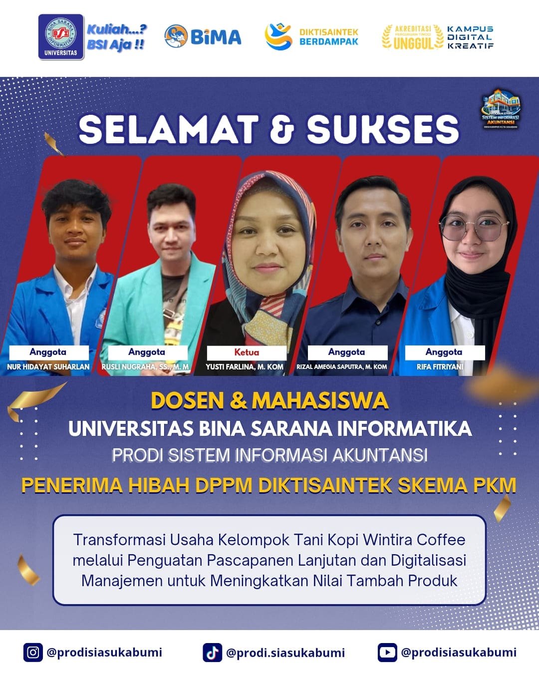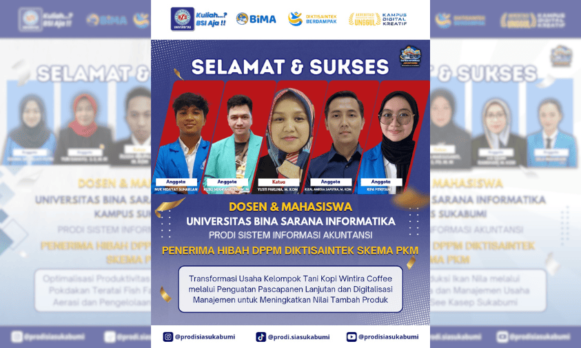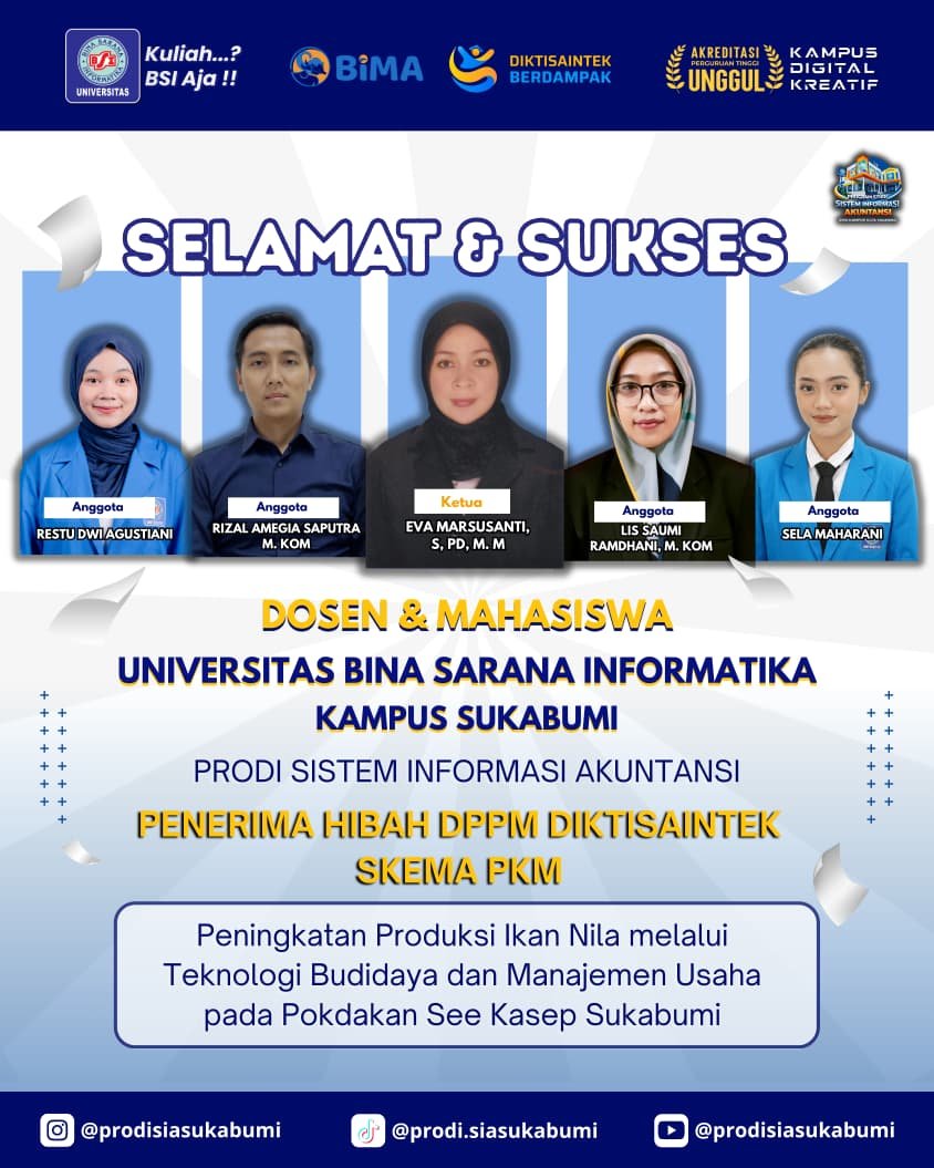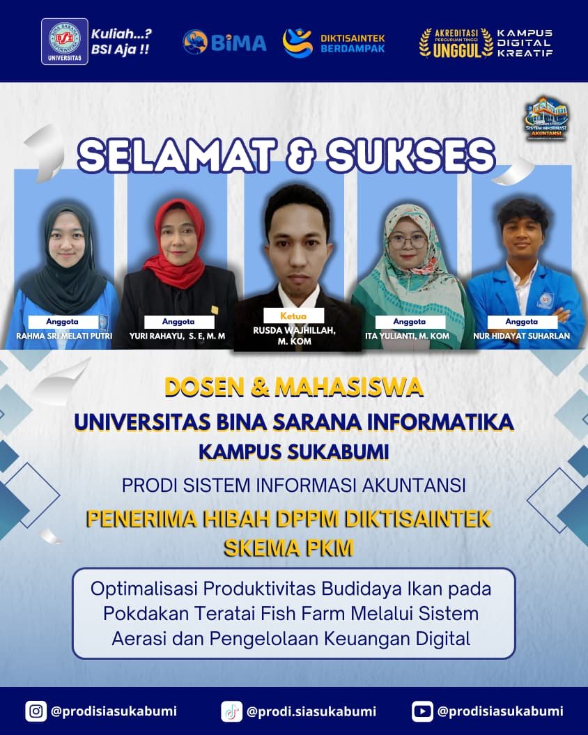 Sukabumihitz – Program Studi Sistem Informasi Akuntansi (SIA) Universitas Bina Sarana Informatika (UBSI) Sukabumi kembali meraih prestasi membanggakan. Pada tahun 2026, sebanyak tiga kelompok dosen dan mahasiswa Prodi SIA berhasil lolos sebagai penerima pendanaan hibah 2026 Program Pengabdian kepada Masyarakat. Kegiatan ini diselenggarakan oleh Direktorat Penelitian dan Pengabdian kepada Masyarakat (DPPM) Kementerian Pendidikan Tinggi, Sains, dan Teknologi (Kemdiktisantek).