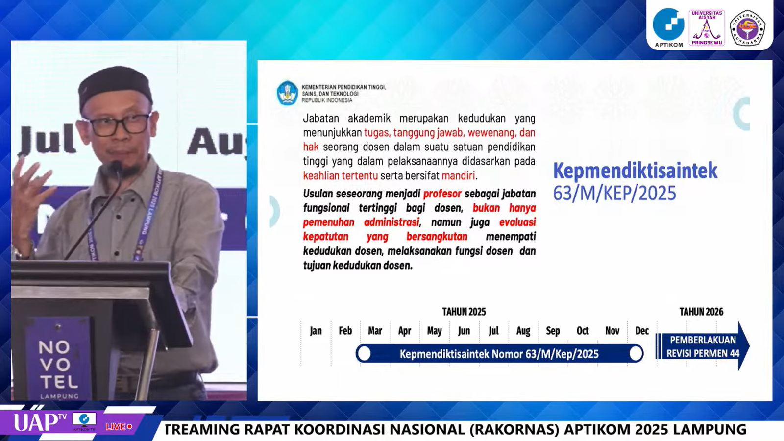 Sukabumihitz – Rangkaian kegiatan Rapat Koordinasi Nasional (Rakornas) APTIKOM 2025 pada (9/10), menghadirkan sesi inspiratif bertajuk Professor Talk yang menampilkan dua narasumber terkemuka, yaitu Prof. Drs. Heru Suhartanto, M.Sc., Ph.D. guru besar Universitas Indonesia dan Prof. Dr. Suyanto, S.T., M.Sc. guru besar Telkom University. Kegiatan ini berlangsung di Ballroom Hotel Novotel Bandar Lampung dan menjadi ajang berbagi gagasan strategis bagi para akademisi serta pengelola pgendidikan tinggi di bidang teknologi dan komputer di seluruh Indonesia.