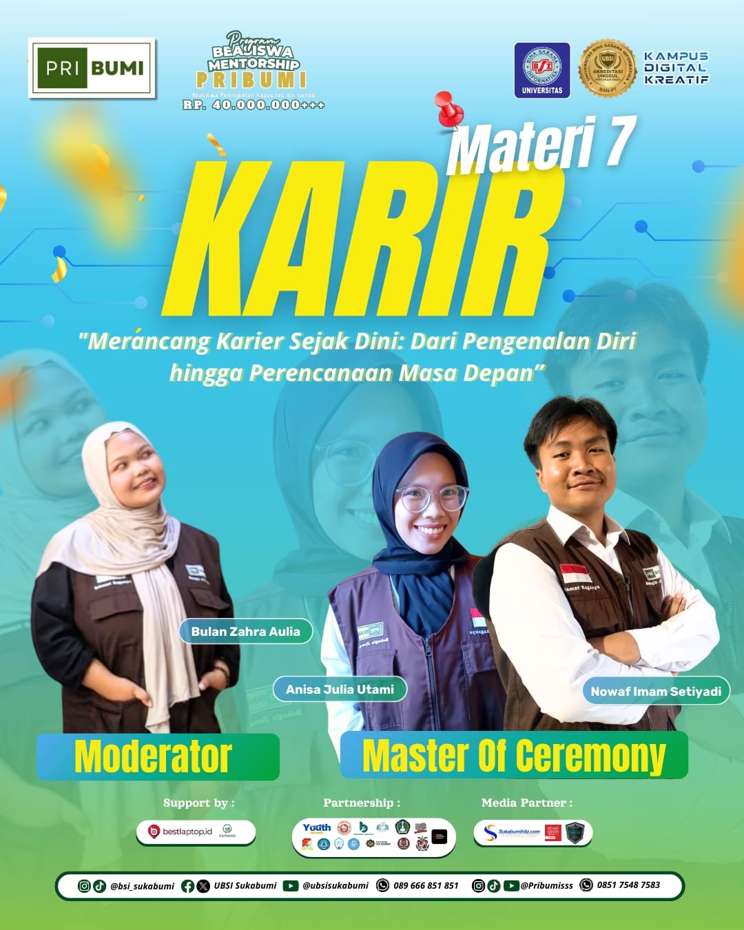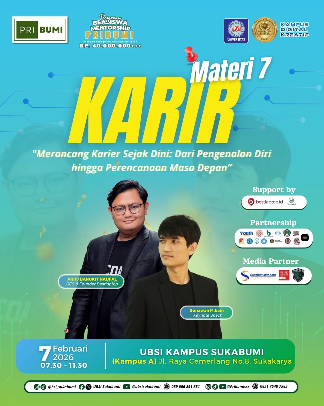 Kegiatan yang termasuk dalam rangkaian Materi 7 tersebut mengangkat topik “Merancang Karier Sejak Dini: Dari Pengenalan Diri hingga Perencanaan Masa Depan”. Agenda ini akan berlangsung pada (07/2) di Aula Kampus UBSI Sukabumi.